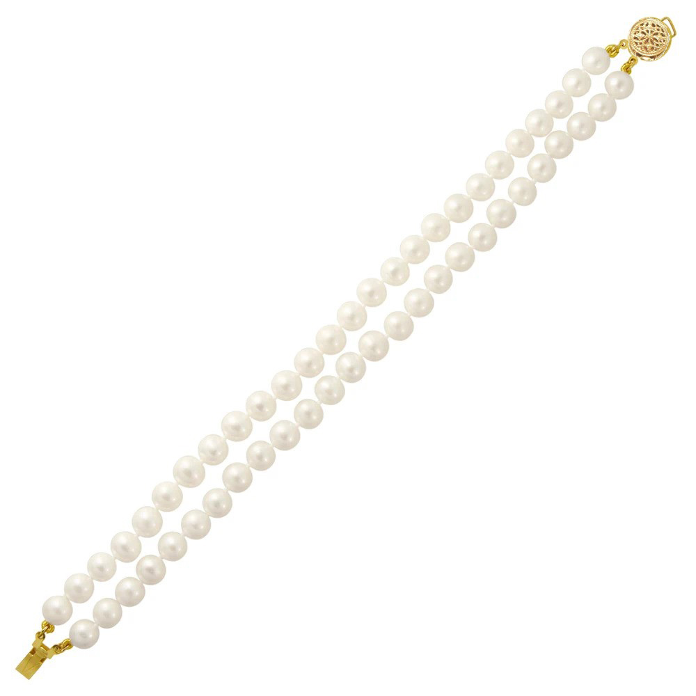 • Ένα υπέροχο βραχιόλι με 2 σειρές λευκά μαργαριτάρια, άριστης ποιότητας διαμέτρου 6 - 6,5 χιλιοστών και χρυσό κούμπωμα ασφαλείας 14 καρατίων.