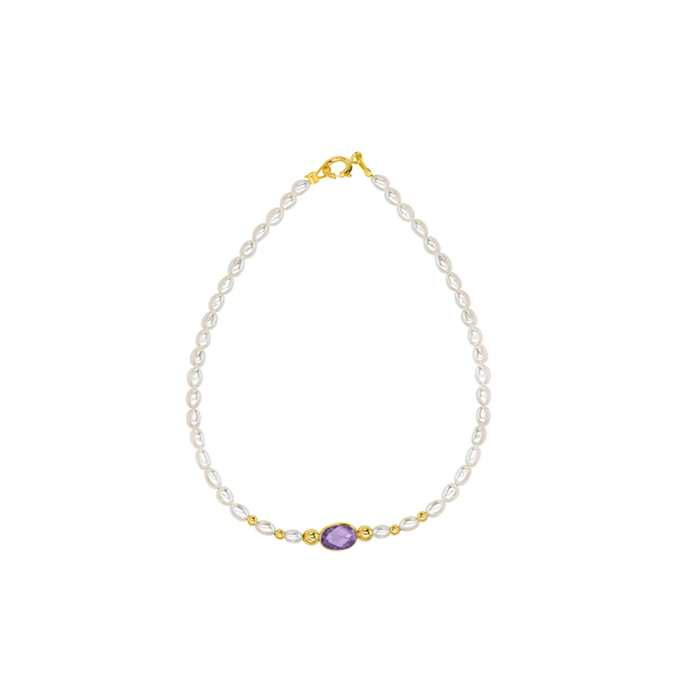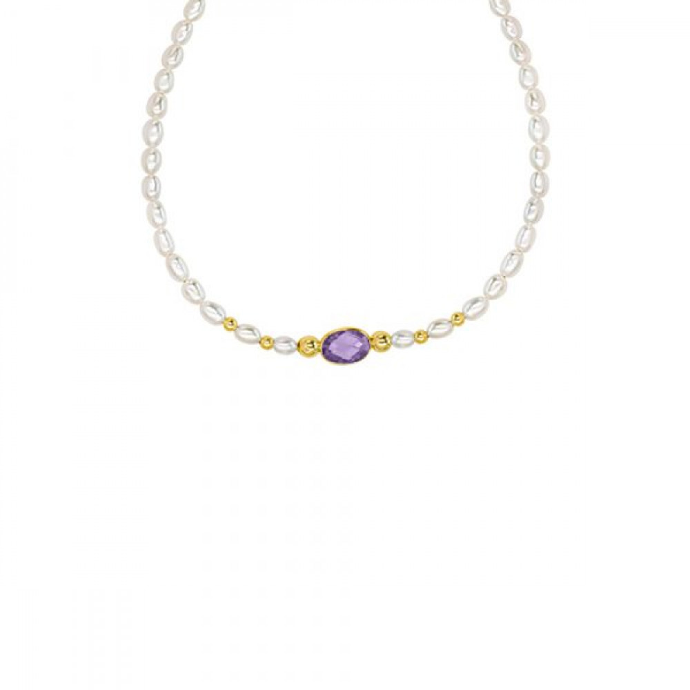 Βραχιόλι Κ14 χρυσό με λευκά μαργαριτάρια, amethyst και χρυσά στοιχεία Κ14 - F124153A
