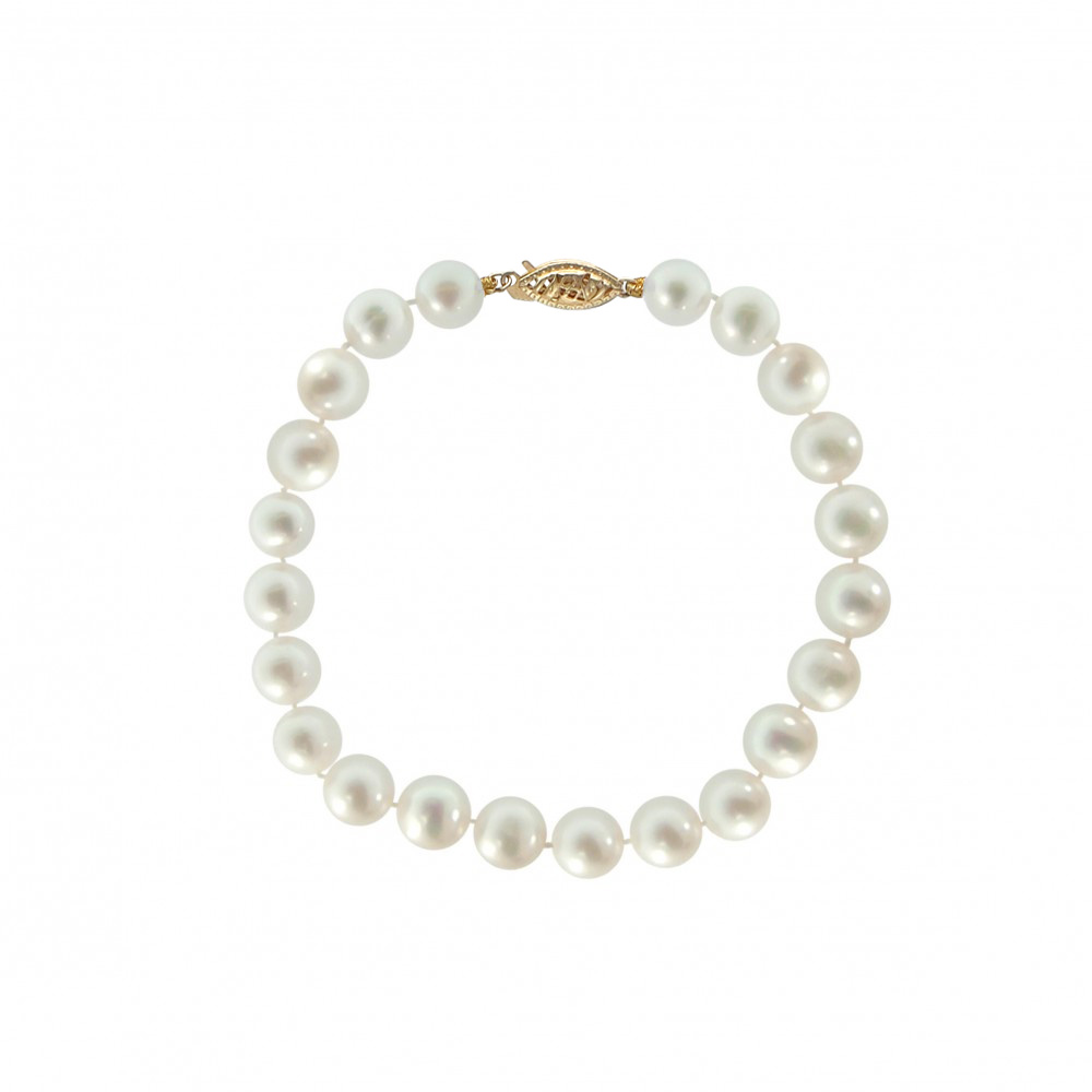 • Ένα υπέροχο βραχιόλι με λευκά μαργαριτάρια Fresh Water Pearl άριστης ποιότητας διαμέτρου 7,5 - 8 χιλιοστών και χρυσό κούμπωμα ασφαλείας 14 καρατίων.