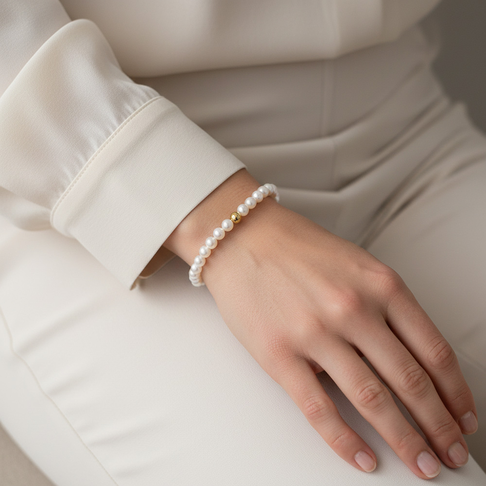 • Ένα υπέροχο βραχιόλι με λευκά μαργαριτάρια Fresh Water Pearl διαμέτρου 5 - 5,5 χιλιοστών.