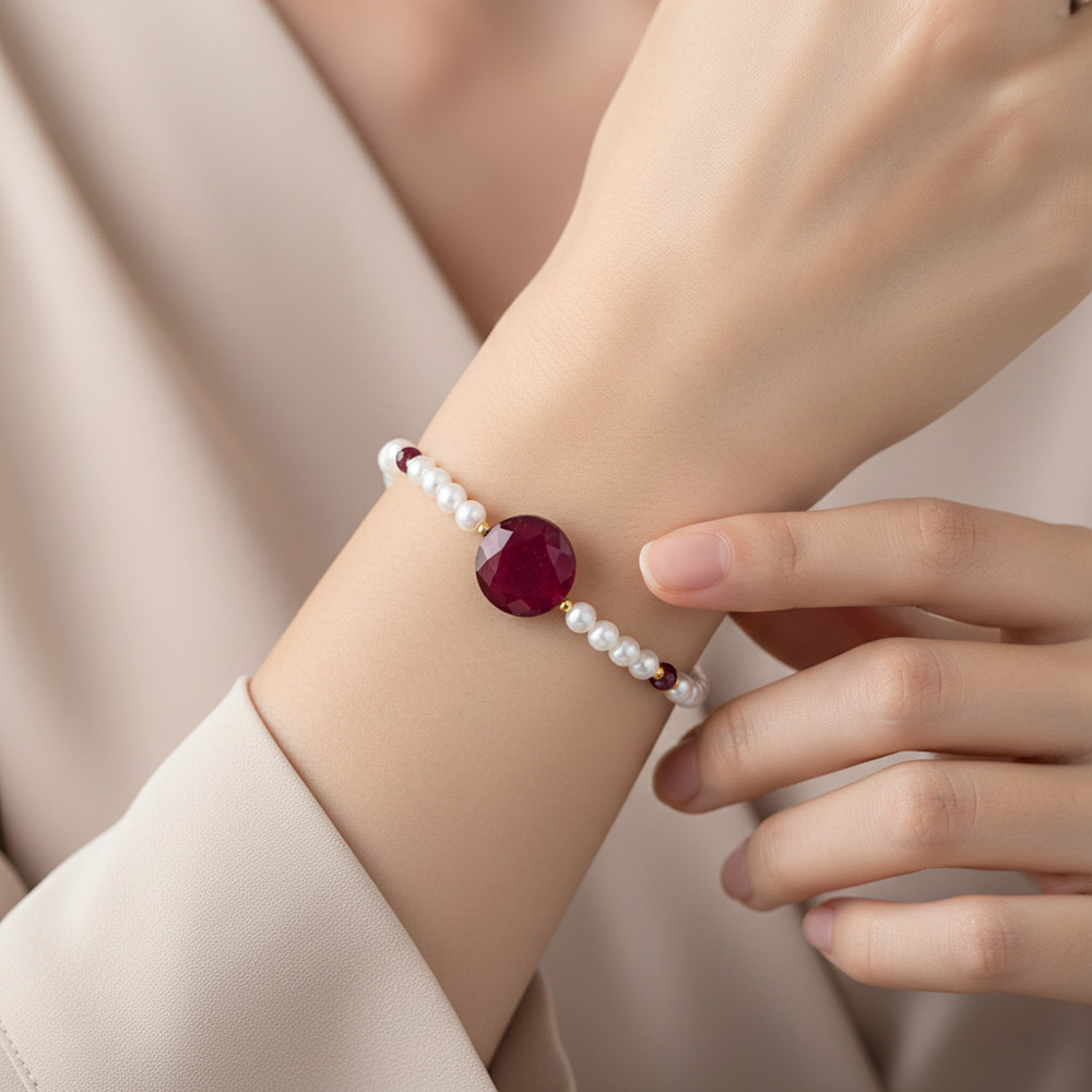 Ανάμεσά στα μαργαριτάρια υπάρχουν 3 ρουμπίνιαένα κεντρικό διαμέτρου 12 -13 χιλιοστών και δυο διαμέτρου 3 - 4 χιλιοστών, καθώς και 6 χρυσά στοιχεία 14 καρατίων, δίνοντας ένα ξεχωριστό και ιδιαίτερο στυλ στο βραχιόλι.