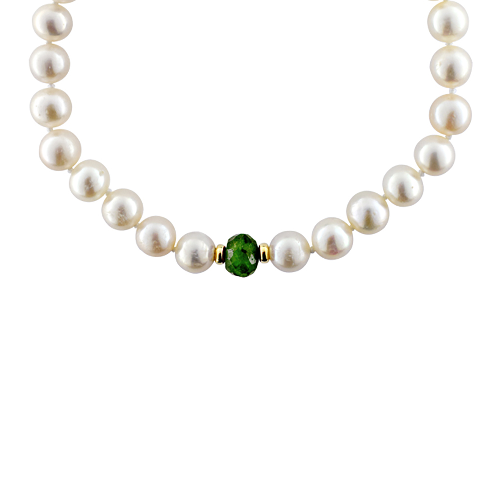 Είναι δεμένο με μεταξωτό νήμα που δημιουργεί κόμπους ενδιάμεσα στα μαργαριτάρια για λόγους προστασίας και ασφάλειας.
