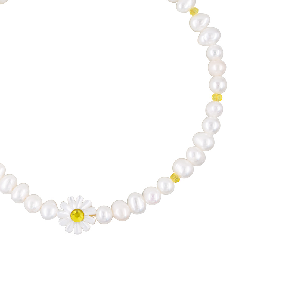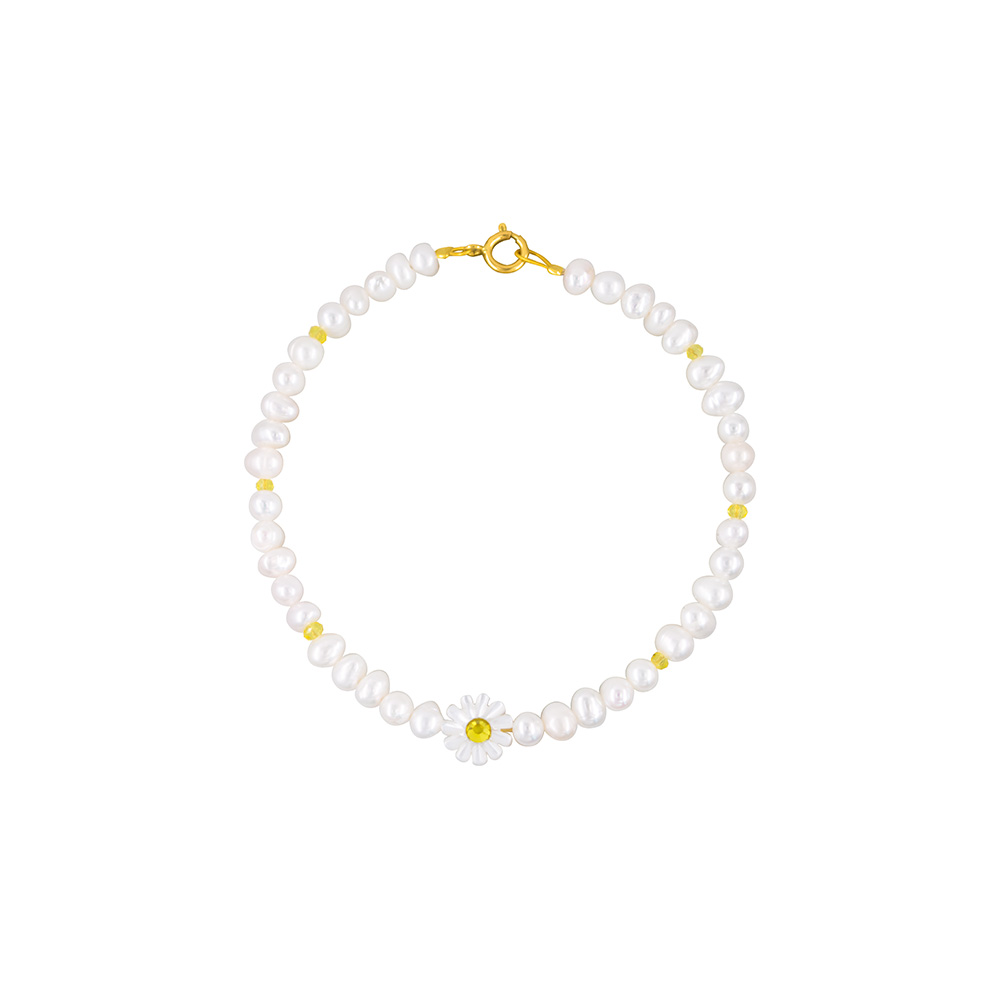 Διάσπαρτα στο βραχιόλι υπάρχουν 6 φασεταρισμένα ζιργκόν κίτρινου χρώματος και στο κέντρο του υπάρχει ένα μενταγιόν λουλούδι από Shell Pearl διαμέτρου 9 χιλιοστών.