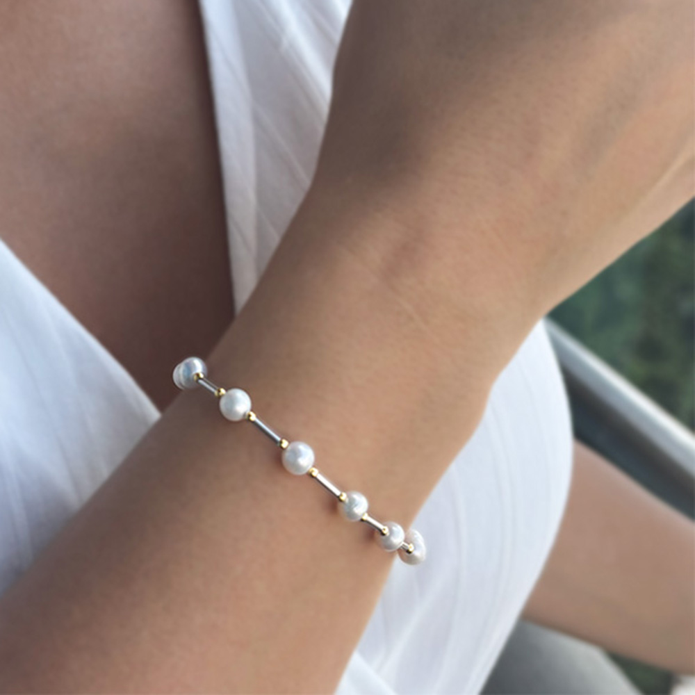 Βραχιόλι με Κ14 χρυσά και λευκόχρυσα στοιχεία και λευκά μαργαριτάρια - B126433