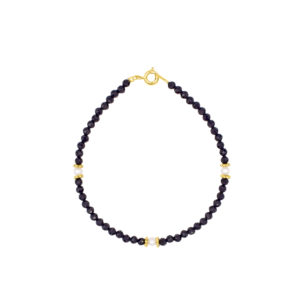 • Ένα εντυπωσιακό βραχιόλι με φασεταρισμένους ημιπολύτιμους λίθους Spinel διαμέτρου 3 - 3,5 χιλιοστών και 3 λευκά μαργαριτάρια γλυκού νερού Fresh Water Pearl διαμέτρου 4-4,5 χιλιοστών.