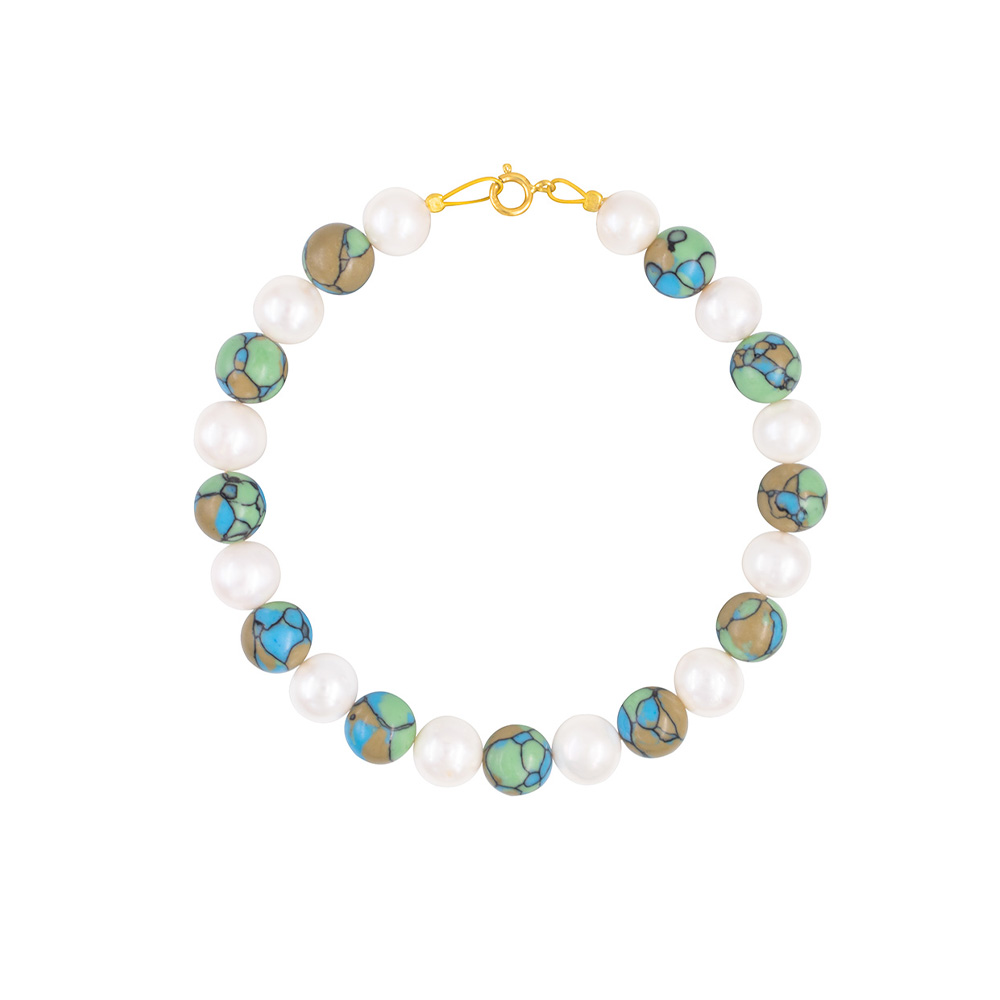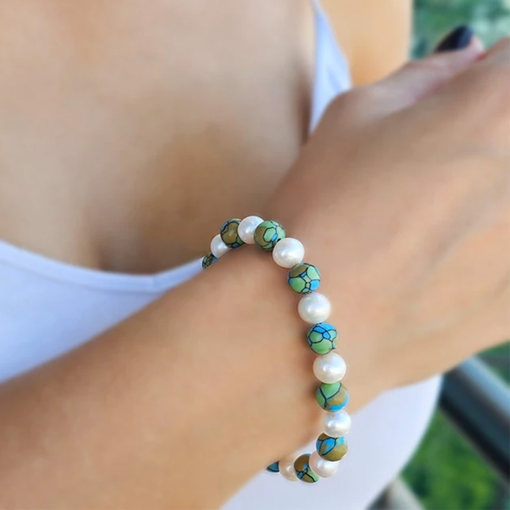 • Ένα υπέροχο βραχιόλι με λευκά μαργαριτάρια Fresh Water Pearl διαμέτρου 7-8 χιλιοστών σε σχήμα Round.
