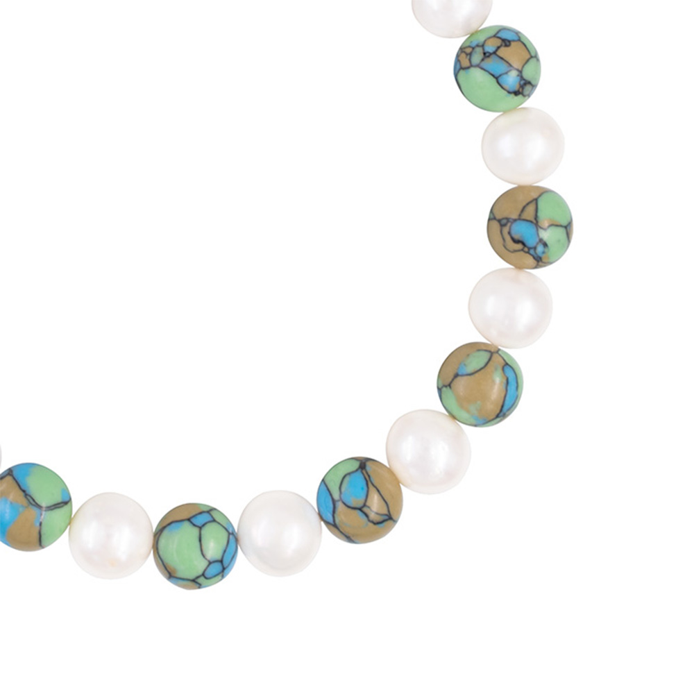 Το βραχιόλι εντυπωσιάζει με το σχέδιό του καθώς ενδιάμεσα στα μαργαριτάρια υπάρχουν στρόγγυλοι ημιπολύτιμοι λίθοι Spiny Oyster διαμέτρου 8 χιλιοστών.