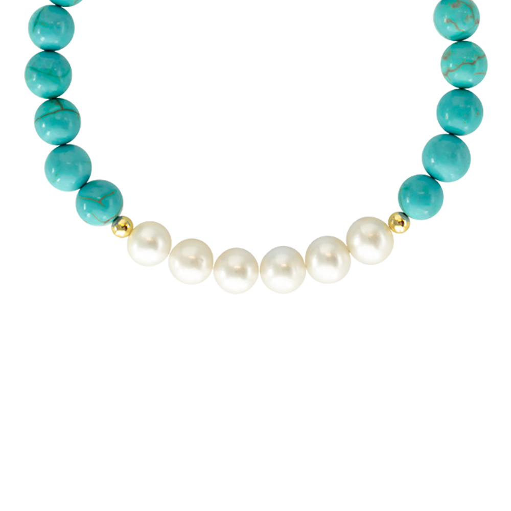 Τα μαργαριτάρια χωρίζονται από τα τιρκουάζ με 2 χρυσές ροδέλες 14 καρατίων.