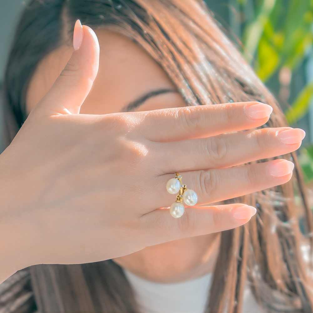 • Ένα φανταστικό δαχτυλίδι με 3 λευκά και εντυπωσιακά μαργαριτάρια Fresh Water Pearl, άριστης ποιότητας διαμέτρου 8 -9 χιλιοστών.