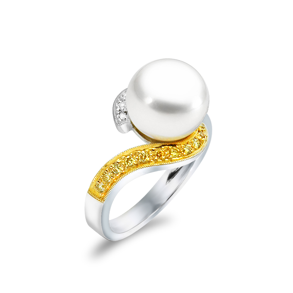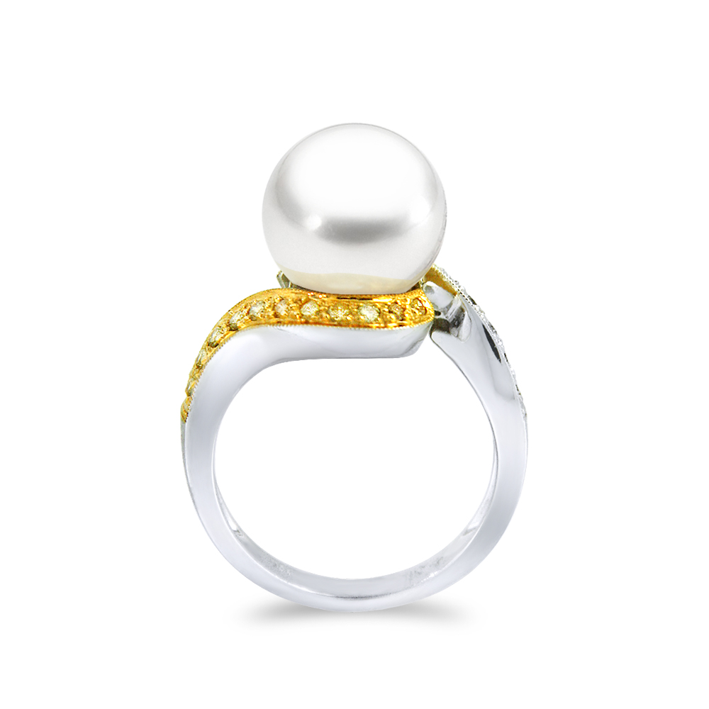 • Ένα υπέροχο λευκόχρυσο από 18 καράτια χρυσού με λευκό μαργαριτάρι South Sea Pearl, άριστης ποιότητας διαμέτρου 10,7 χιλιοστών και 20 διαμάντια 0,30 καρατίων.
